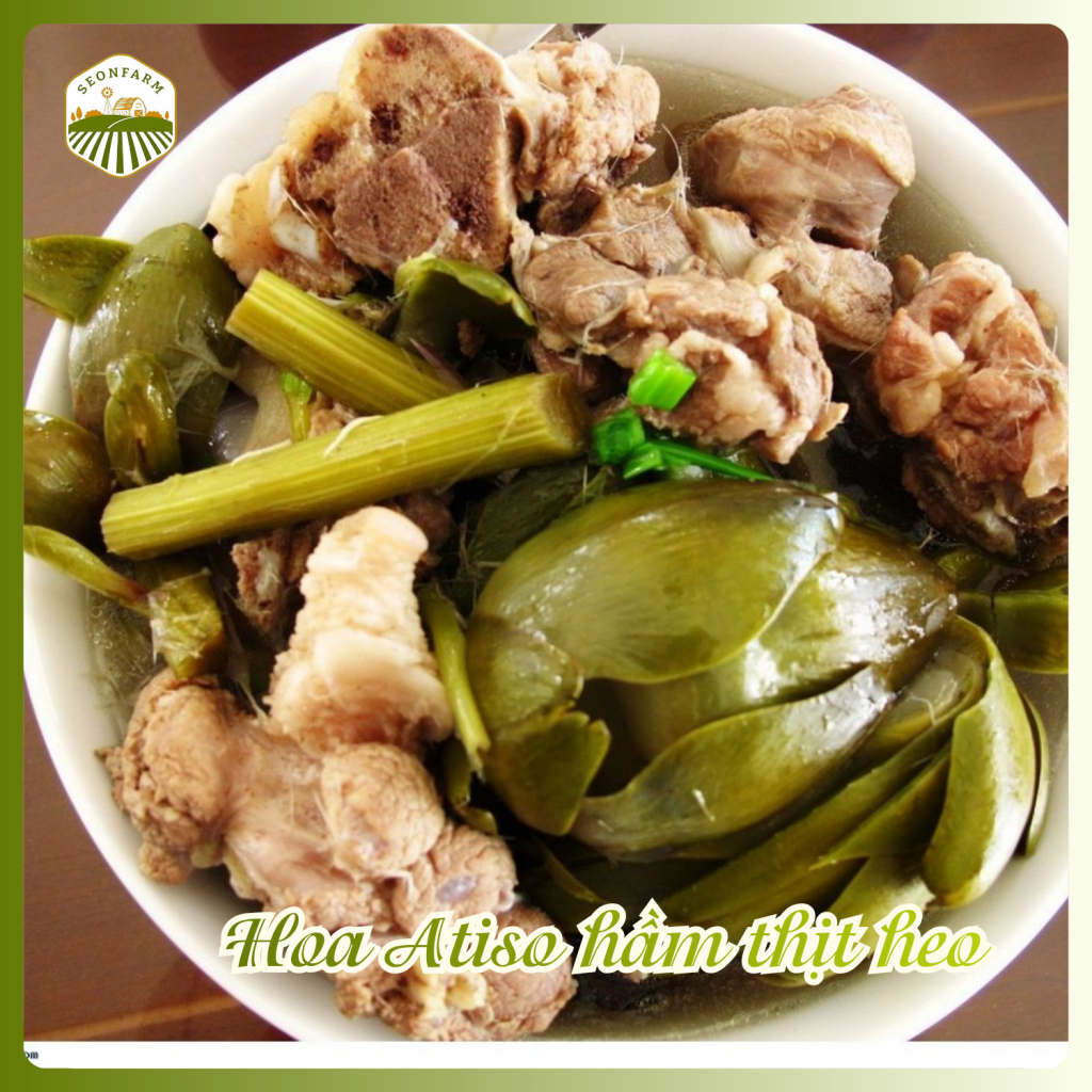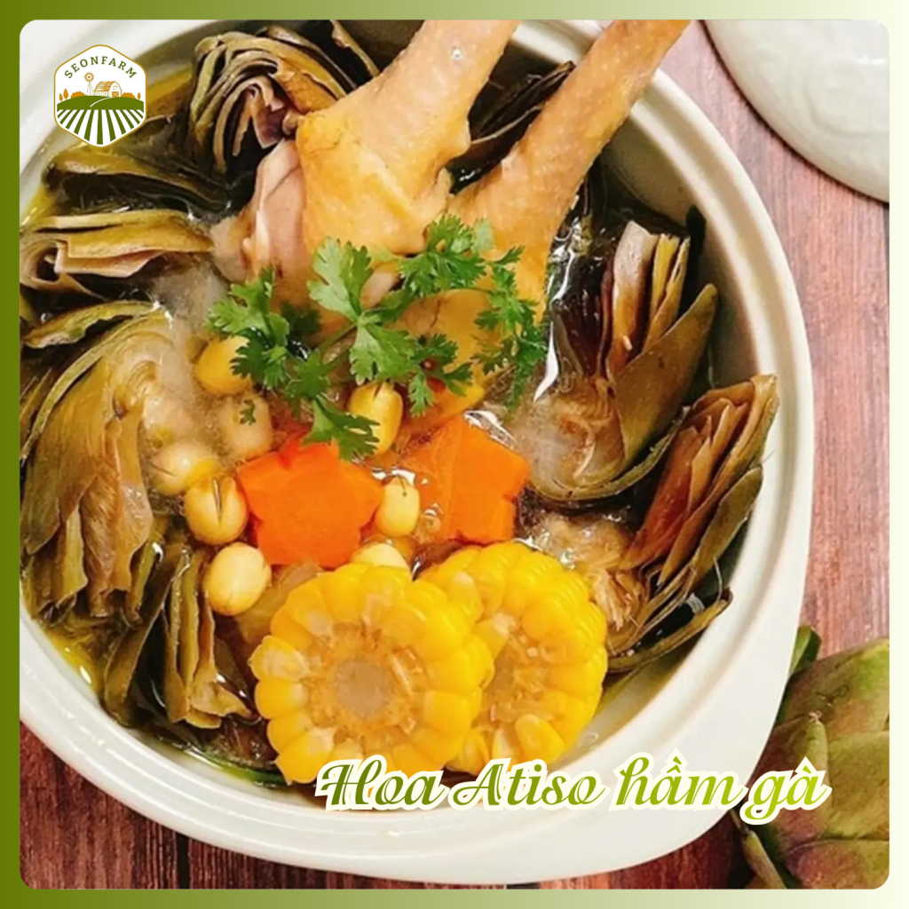 Hầm atiso cho nước ngọt thanh. Bông atiso tươi khi hầm sẽ tiết nhiều chất vào nước. Bạn có thể hầm chung với xương heo hoặc đậu xanh. Món này phù hợp cho bữa tối nhẹ. Thời gian hầm khoảng 40 phút. Hầm quá lâu sẽ làm bông rã và mất chất.