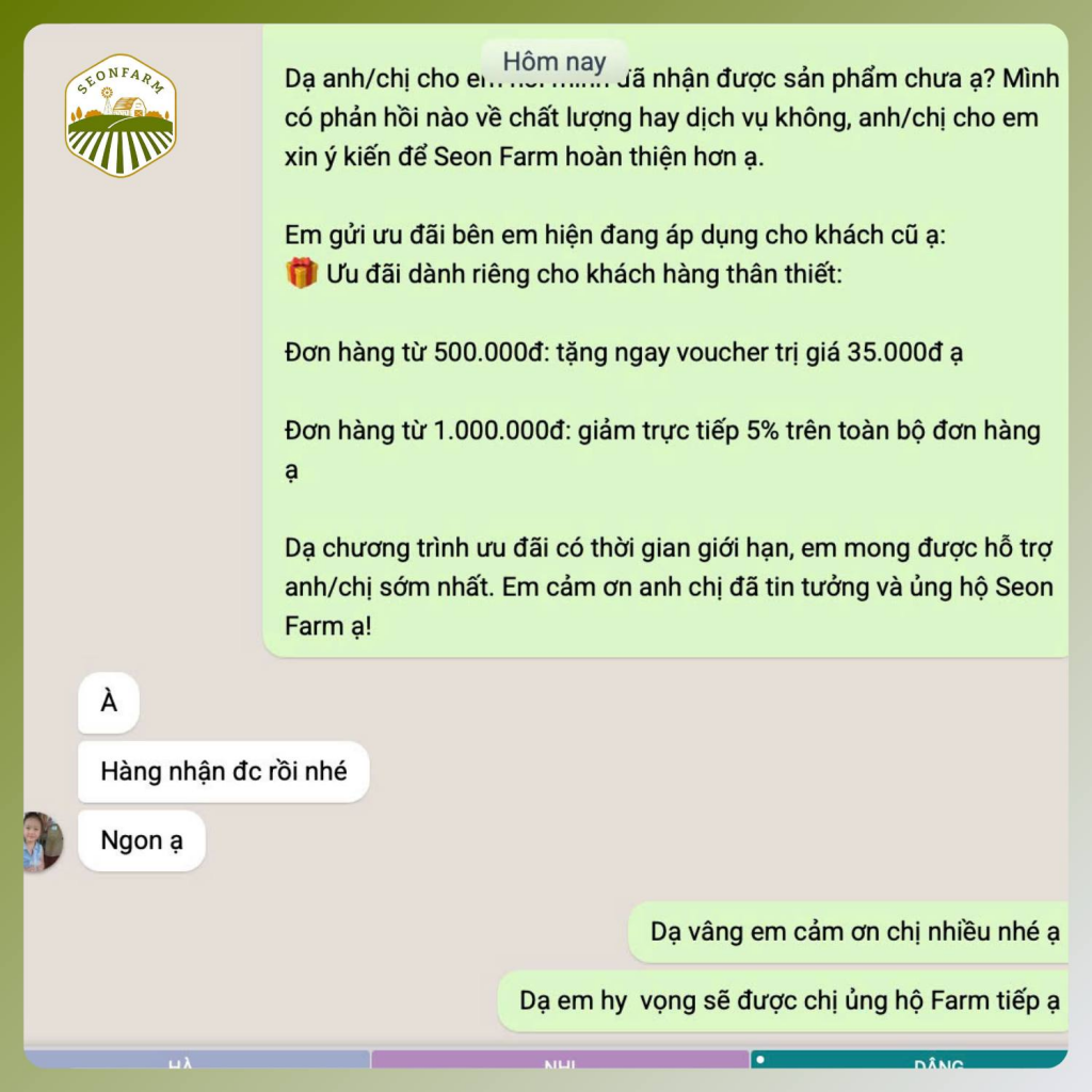 Không có bất kỳ chiến dịch quảng cáo nào hiệu quả hơn những lời phản hồi thực tế từ người dùng. Mới đây, niềm hạnh phúc của đội ngũ chúng tôi đã vỡ òa khi nhận được tin nhắn từ một khách hàng ở tỉnh xa: “Hàng nhận được rồi nhé, ngon ạ”. Chỉ vài chữ ngắn ngủi nhưng đó là minh chứng rõ nhất cho việc SeonFarm đã vượt qua được những rào cản về địa lý để mang nông sản sạch đến tận tay người tiêu dùng một cách trọn vẹn nhất.