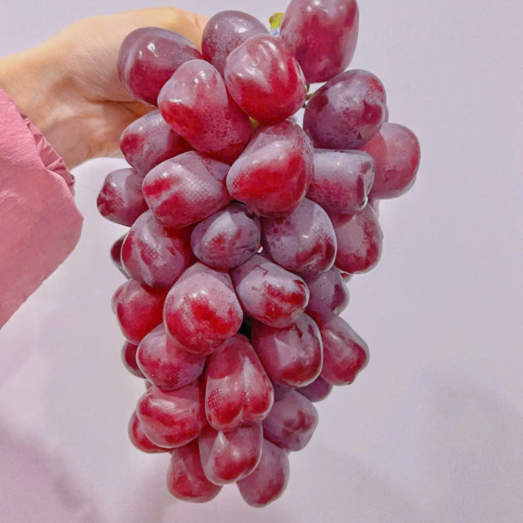 Điểm đặc biệt của loại nho này là hình dáng quả. Mỗi quả nho mang hình trái tim nhỏ nhắn, màu đỏ ánh hồng pha sữa vô cùng bắt mắt. Khi cầm chùm nho trên tay, bạn dễ dàng cảm nhận được độ căng mọng và lớp phấn mịn tự nhiên phủ nhẹ bên ngoài.