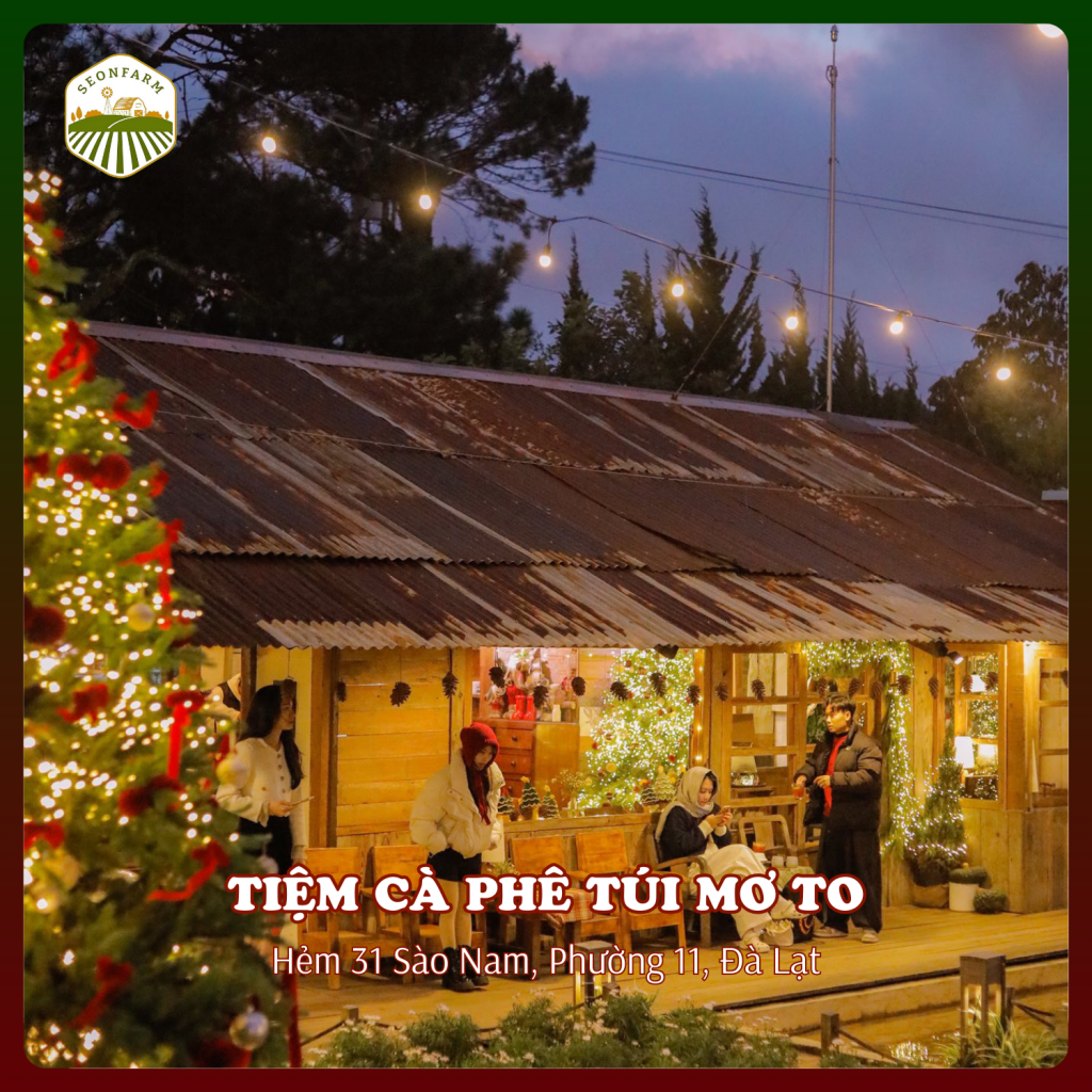 TIỆM CÀ PHÊ TÚI MƠ TO là một cái tên quen thuộc. Quán nổi tiếng với view rừng thông tuyệt đẹp. Vào mùa Noel, quán càng trở nên lung linh hơn. Hàng ngàn ánh đèn được thắp sáng rực rỡ.